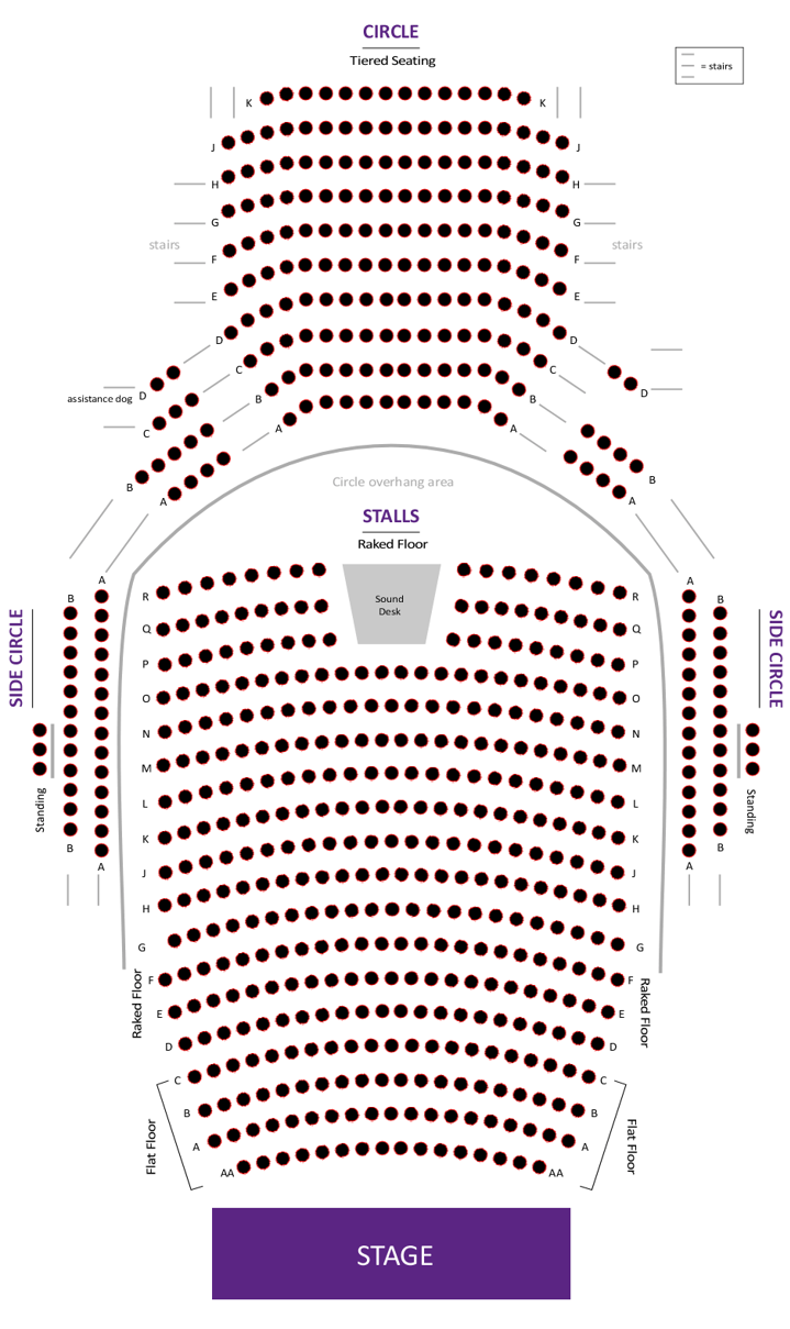 The circle is on the upper floor of the theatre and is accessed by lift or stairs. The seating is tiered and there are a number of stairs to navigate to all areas apart from the wheelchair user spaces. Customers are requested to remain seated during the performance, but there are standing spaces available on the side circle available to book.